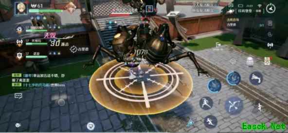 第三个技能:BOSS发射跟踪导弹,在玩家站立地区和周围进行轰炸,这个技能在场中一直跑动就可以躲避,毕竟发射的导弹也是有限的,只要你跑得快它就跟不上你。这个技能是可以跟第二个技能进行联动,就像图中一样,但是也是不难躲避的。注意一下应该没什么大问题,不要慌乱。