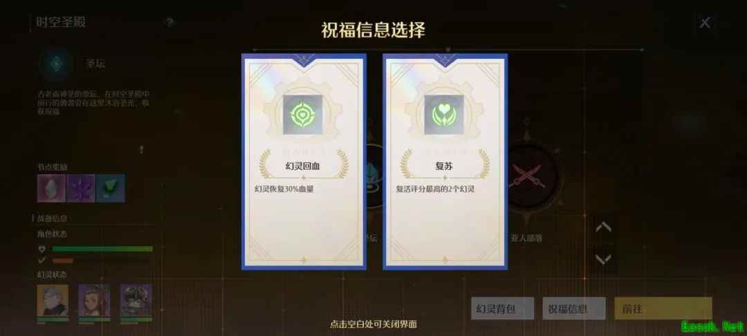 圣徒的祝福信息可以回复幻灵30%血量或复活评分最高的2位幻灵,在幻灵血量较低时,遇到圣坛,记得选择恢复幻灵血量。