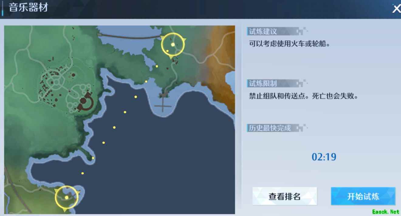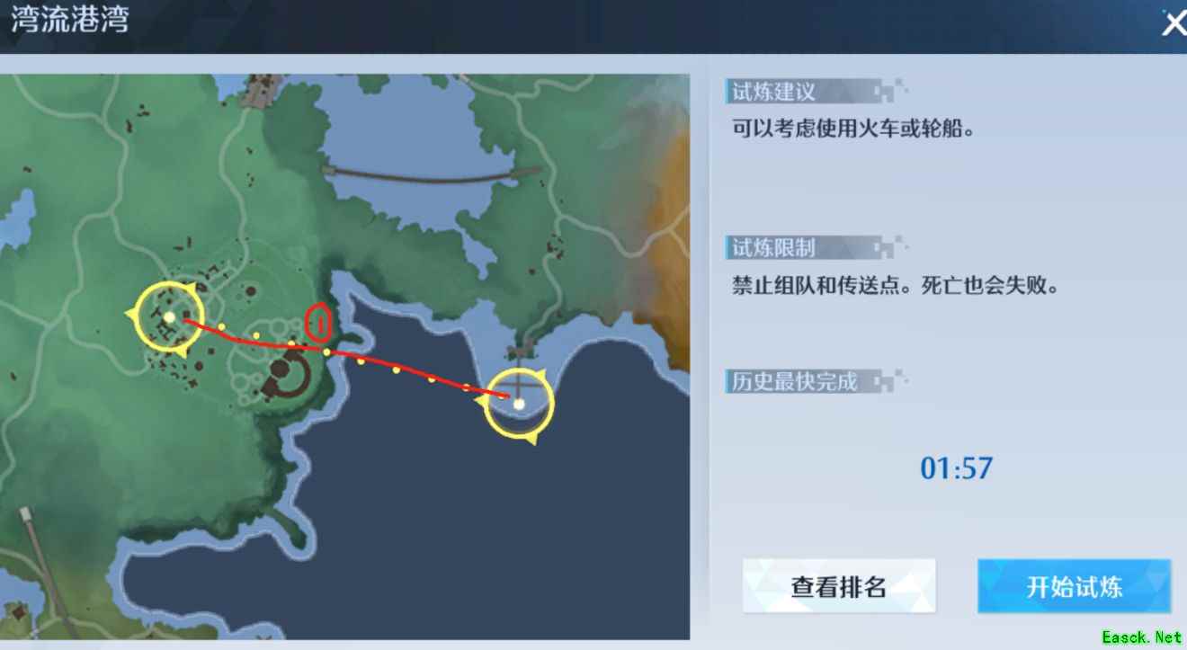 具体方法为:接受试炼任务后,立即骑马并使用钩索快速移动到①号点,然后使用喷气背包一直飞到终点即可,这个方法较为简单,但是不适合冲榜,冲榜的话我建议冒险家们选择第一个方法。