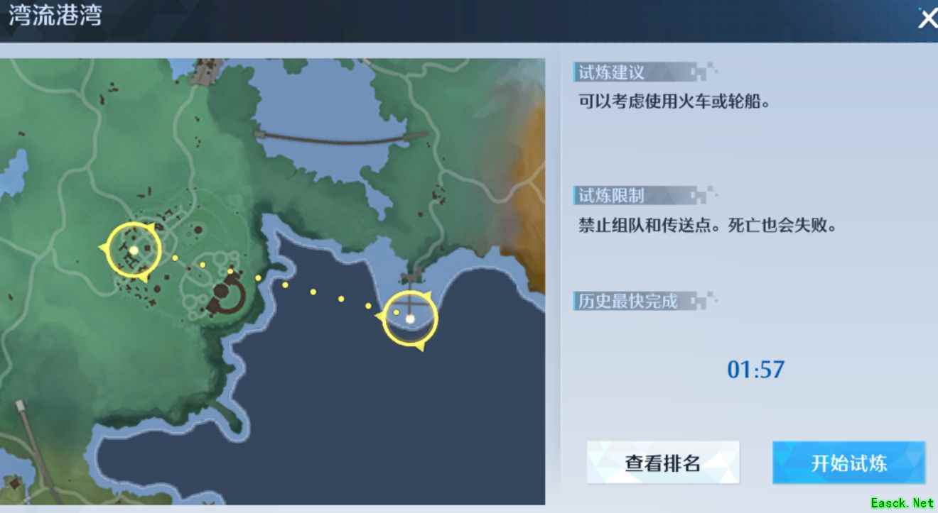 ①乘坐火车:接受试炼任务后,前往地图左下角的灵泉站乘坐火车,先前往湾流城火车站,后继续乘坐火车到达商会联盟站,这一种方式比较费时间,不适合冲榜。