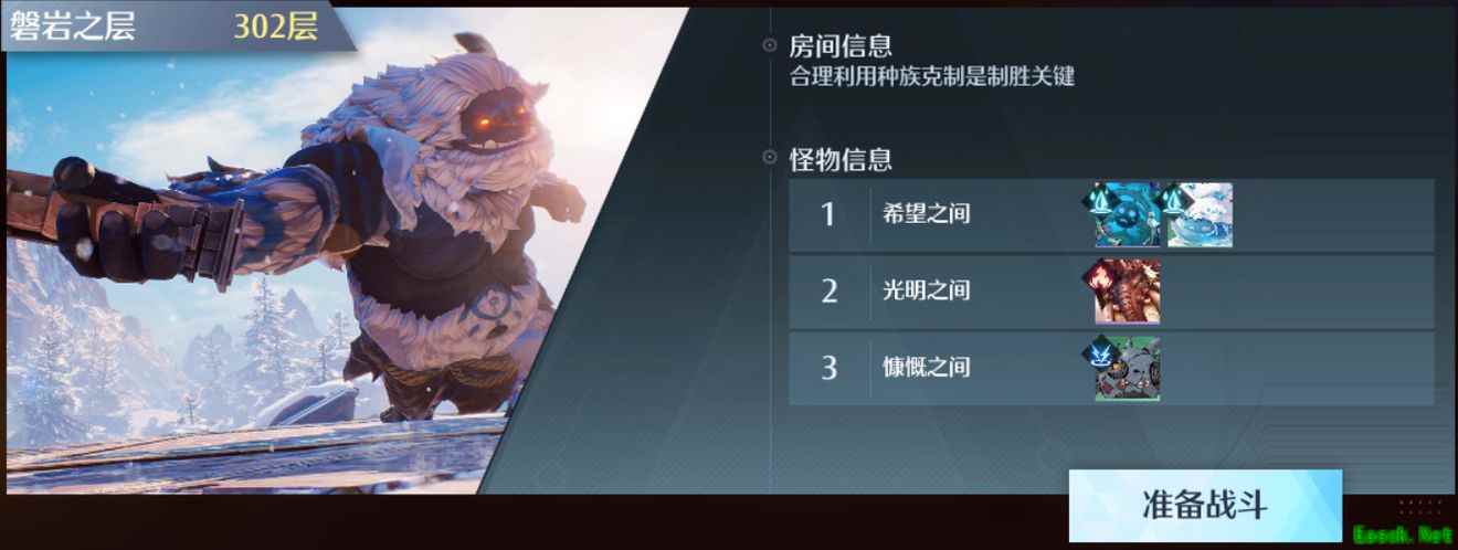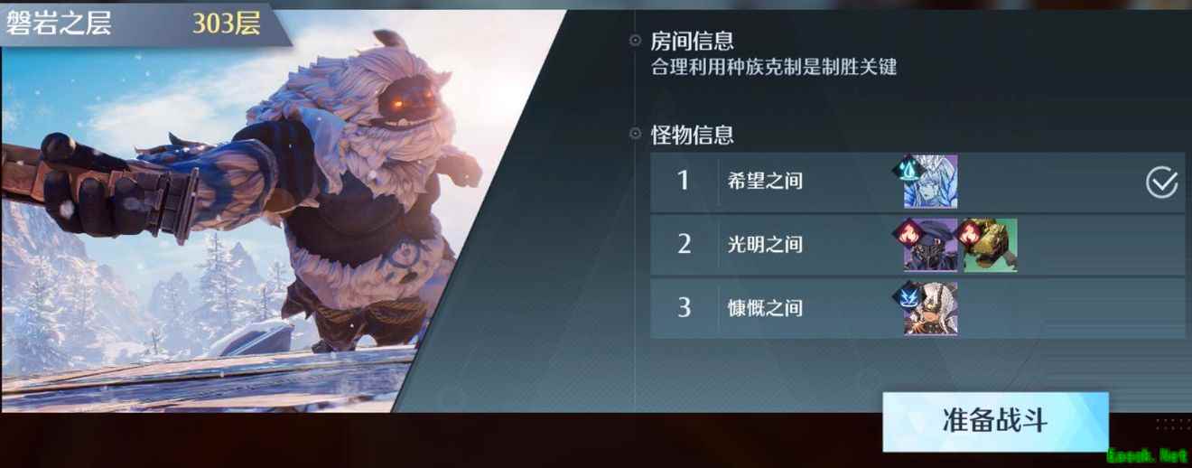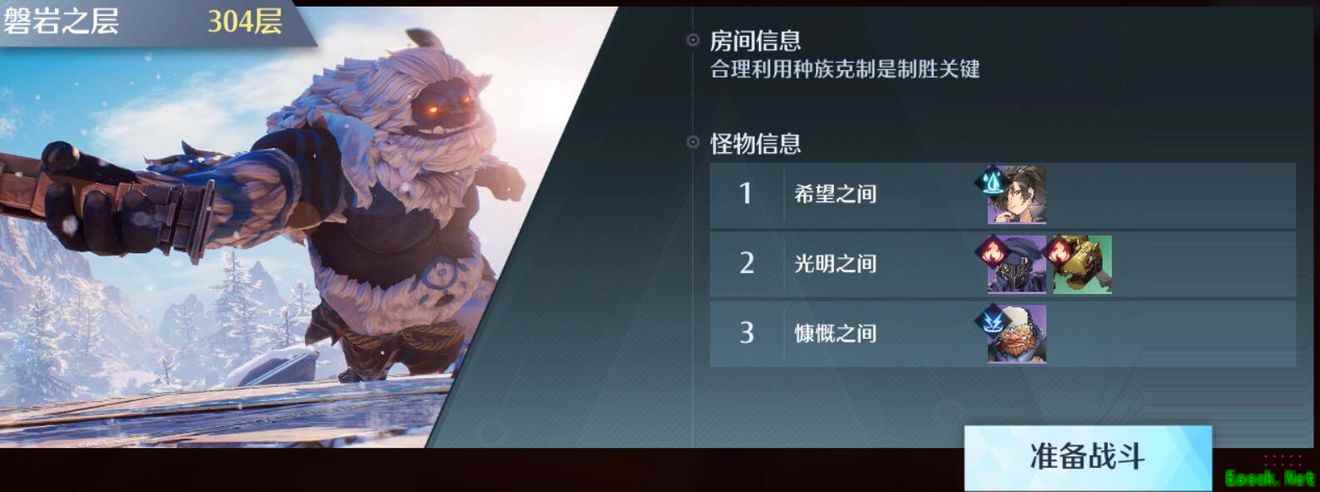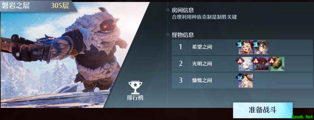 301层到304层中,这四层怪物种族相似,所以推荐三套幻灵阵容即可轻松通关这四关,第一层推荐附体雅芙·零,其余幻灵为诺亚·零,卡弥·史密斯和雪琳·福尔摩斯,主要选择依据为这一关的推荐评分为黄颜色(幻灵星级越高,提供全局增伤越高,推荐四个幻灵总星级在35星左右)。第二层推荐附体英格拉姆·柏拉图,其余幻灵佣兵为伽诺斯·欧几里德,夏莉·格兰杰和小影·玛蒂拉。这一套幻灵阵容中有三个紫色幻灵,有一个SSR,成型较容易,推荐总星级幻灵在40星左右,因为第一层和第二层怪物种族的关系,所以第二层比第一层的幻灵阵容增伤要高7%左右。第一层和第二层的幻灵评分在35W分左右。第三层推荐附体真田·幸子,其余幻灵佣兵为维克塔·雨果,乔妮·斯派罗和尤岚·阿希拉,主要选择幻灵的依据为烈焰种族,幻灵总评分在22W左右,星级在24星左右,全局增伤+30%。