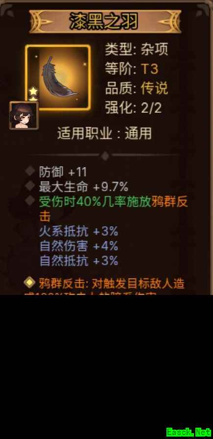 还有这个乌鸦之羽,受伤40%几率反击,对敌人造成100%攻击力的暗属性伤害。暗属性克制水 火 自然,而且目前没有光属性的怪物,输出挺疼的。