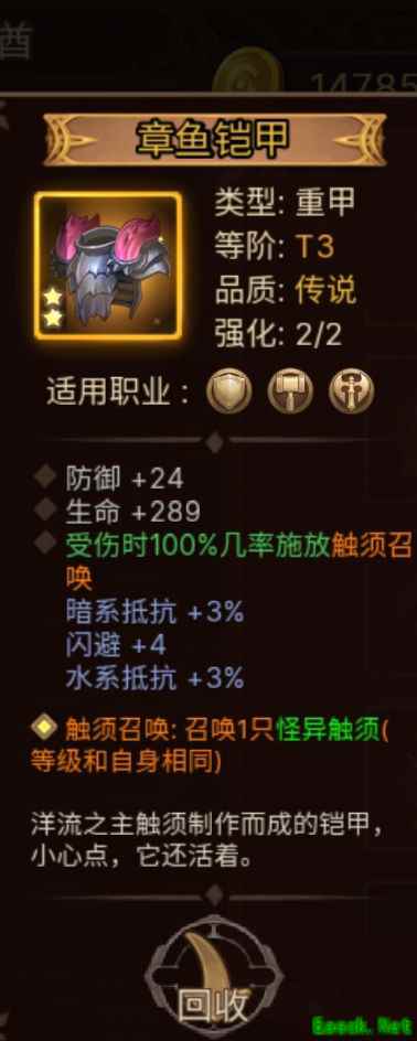 这是前期最容易出的俩装备,章鱼铠甲受伤召唤触手,伤害还挺高。而且这个召唤物是无形体的,意思就是怪物不会打它,而触手却可以随意输出。