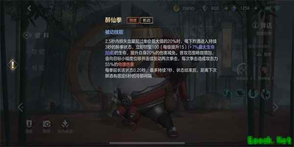 2.5秒内损失血量超过生命最大值的20%时,喝下烈活进入持续3秒的醉拳状态,立即回复100( 每级提升15)(+7%最大生命加成)的生命,提升自身20%的伤赛减免。普攻范围略微增加,会向目标小幅度位移并连续发动两次拳击,每次拳击造成攻击力55%的物理伤害每攀廷长该状态0.20秒,最多持续7秒,状态结束后,距离下次醉酒有固定6秒的冷却间隔。