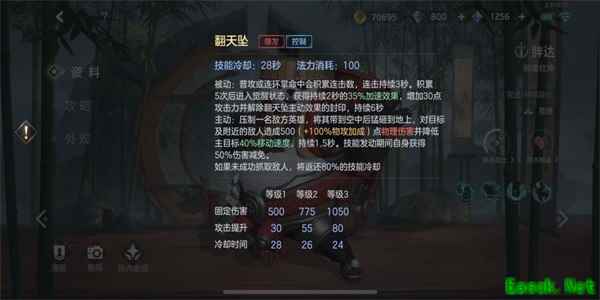 披动:普攻或连环掌命中会职默连击数,连击持续3秒。积默5次后进入觉醒状态,获得持续2秒的35%加造效果,增加30点攻击力并解除翻天坠主动效果的封印,持续6秒主动:压制一名数方英雄,将其带到空中后经砸到地上,对目标及附近的敌人造成500(+100%物攻加]点物理伤害并降低主目标40%移动速度,持续1.5秒。技能发动期间自身获得50%伤售减免,如果未成功抓取敌人,将返还80%的技施冷却。