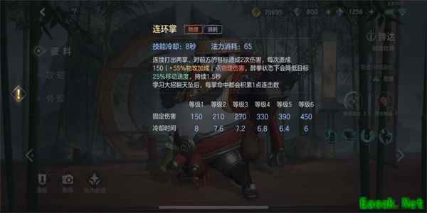 连续打出两掌,对前方的目标透成2次伤害,每次造成150( +55%物攻加成)点物理伤害,醉黎状下会降低目标25%移动速度,持续1.5秒学习大招翻天坠后,每拿命中都会积累1点连击数。