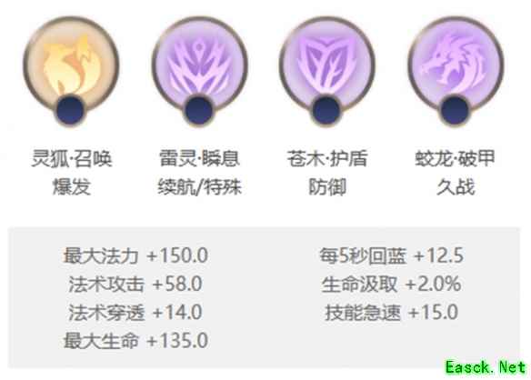 灵狐·召唤、雷灵·瞬息、苍木·护盾、蛟龙·破甲