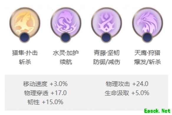 猎隼·扑击、水灵·加护、青藤·坚韧、天鹰·狩猎