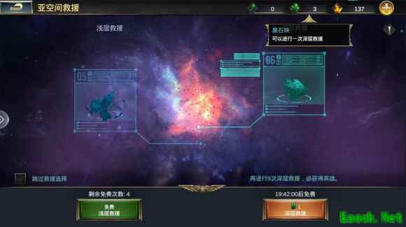 游戏中玩家获取英雄单位的主要途径来自于主基地的“亚空间救援”设定。在这里,玩家每天可以有6次机会免费前往“浅层”进行救援活动。当然,每隔24小时,玩家可以免费获取一次“深层”救援的机会。或是消耗上图中的“黑市碎片”或“黑石块”,开启相应的救援选项。