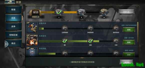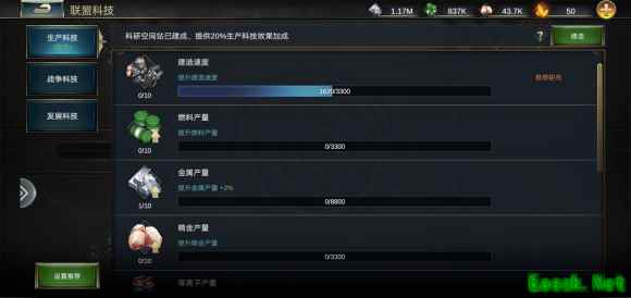 首先,加入联盟的玩家能够享受到联盟科技的加成,和玩家在科研前哨中研究的科技类似,联盟科技也分为生产科技、战争科技与发展科技三种。目前联盟一共有10项生产科技、15项战争科技、9项发展科技可供研究,这些科技提供的效果能与玩家自身的科技提供的效果相叠加,进一步的提升玩家的实力。