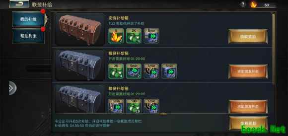 其次,玩家可以通过互动的方式来给予盟友帮助。当盟友发送求助请求或者需要帮忙开启补给时,玩家可以在互助界面和联盟补给界面分别提供帮助。这两种帮助都不需要玩家花费任何资源,后一种更是可以在帮助盟友开启宝藏后,领取到相同的奖励。所以,一旦发现有盟友需要帮助,请不要吝惜你的每次援手。