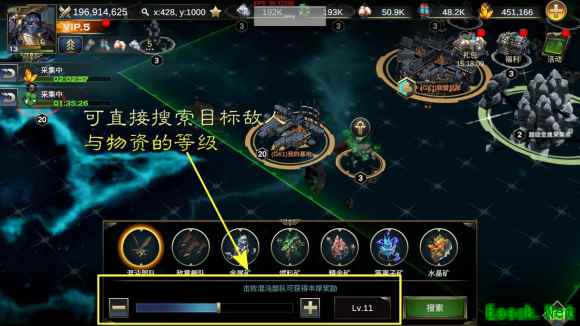 另外,因本作地图极为广袤,制作组设计了“搜索”功能。玩家在选择资源与对手时,可直接选择意向目标的等级,对他们进行定位,既保证游戏充裕可玩性,又节省了游玩者的时间。