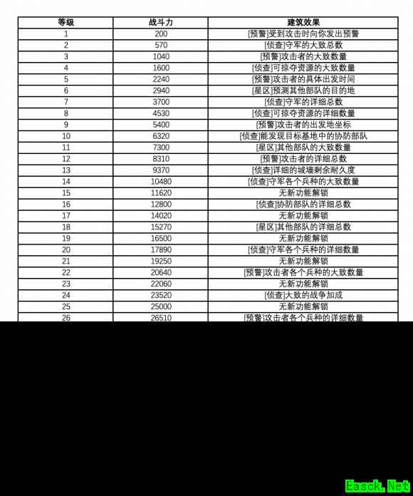 雷达一共有40级,战斗力和建筑效果都会随着等级的提升而增强,尽管不是所有有等级解锁时都有特定效果,但根据等级的提升,对对方行为的了解程度会呈现很明显的变化,例如,第4级时只能侦查到可掠夺资源的大致数量,到了第8级就可以知道其详细数量了。尤其是到了最高级甚至可以了解到攻击者详细的战争加成,帮助指挥官们完美的了解敌方势力。
