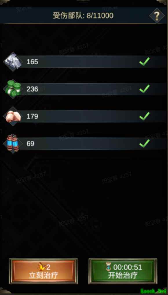 治疗伤兵可以花费水晶直接完成或者等待时间后自动完成,随着药剂师医务站的等级提升,水晶数量和治疗时间都会增加。还能自行选择治疗士兵的数量和种类。
