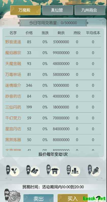 2、系统每天会自动发放10万的商券,商券可用于交易,但是每日只有50万的交易额度。