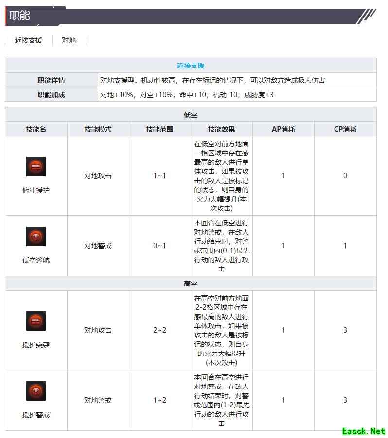 回合开始时,如果自身处于高空,则使前方2~3的空中敌人机动值中幅降低(1回合);如果自身处于低空,则使前方2-3的地面敌人装甲值中幅降低(1回合)