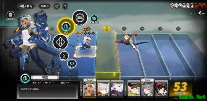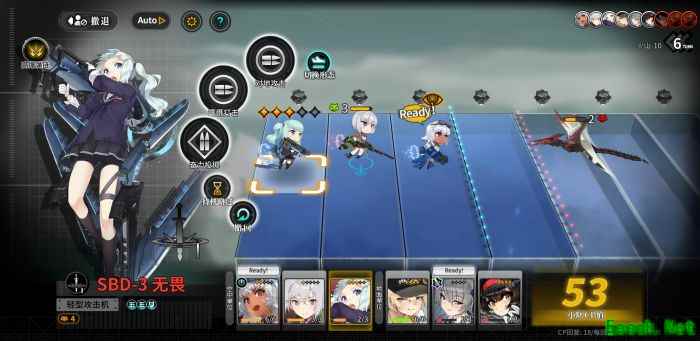 第四回合,侦察机前进一步对地面全部单位进行标记,攻击机前进对boss进行震慑打击降低boss的威胁值,使之后的奇袭白刃单位可以正确的白刃到boss后方的防空单位上,地面继续派人员进入boss流刃一闪β的攻击范围内,有输出能力的单位进行攻击。