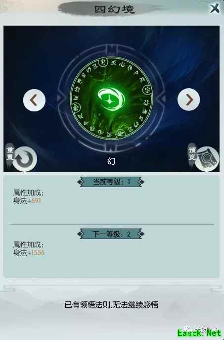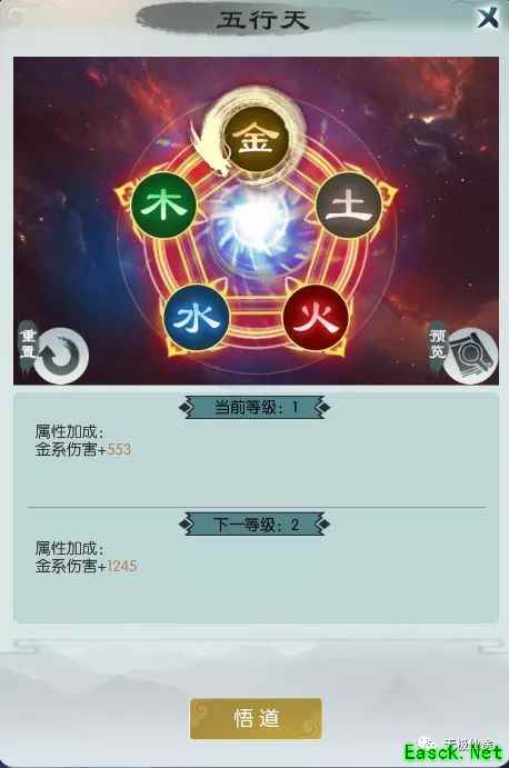 共有金木水火土五行法则可供参悟,参悟后可提高对应属性的伤害,同四幻境一致,只能选择一法则进行参悟。