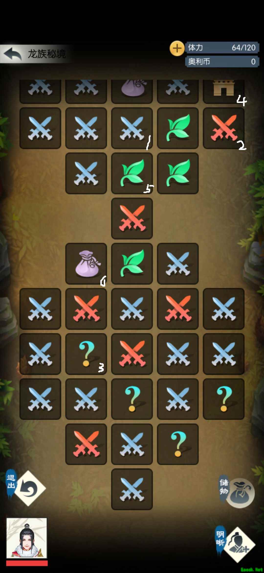 ③问号❓ (类似奇遇,大概率为小怪和触发加血,小概率红色精英怪、商店,极小概率黑衣人,还有一些扣血量加奥利给币以及策划遗留的宝藏—遗迹令牌1个)