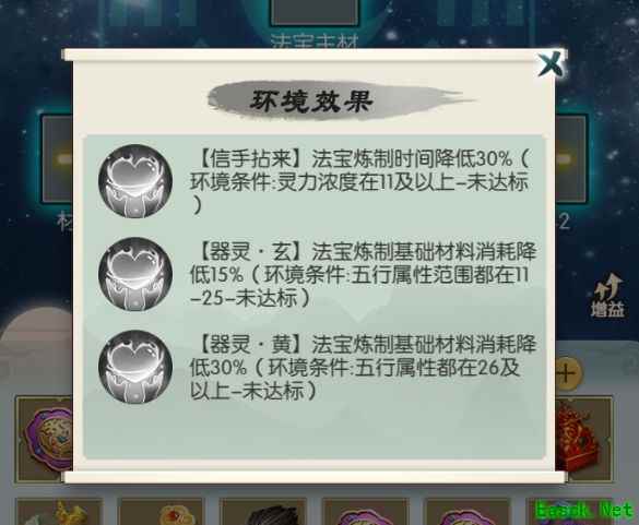 以上图法宝为例,【器灵·玄】这个效果需要五行属性范围都在11-25之间才能激活。也就是对应建筑的五行风水值必须在这个区间范围内,如果是11以下或者25以上则无法激活。