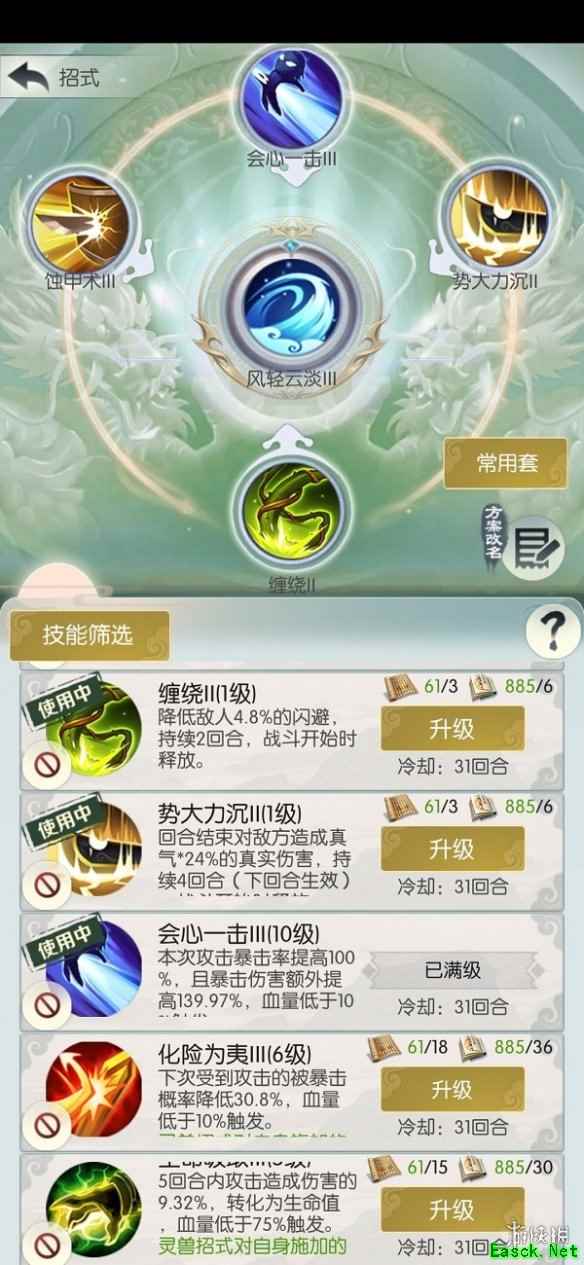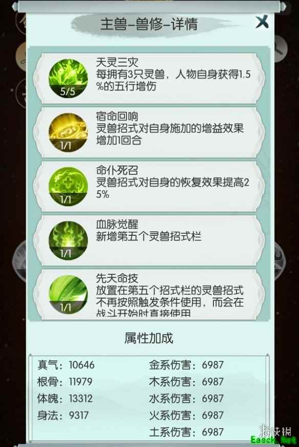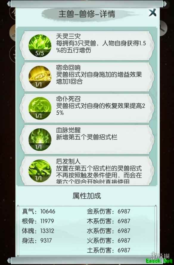 灵兽技:选择会心一击(一二级都可以,三级的建议升满),势大力沉,风轻云淡,蚀甲术等开局减怪抗性、减怪防御、增加攻击的技能。