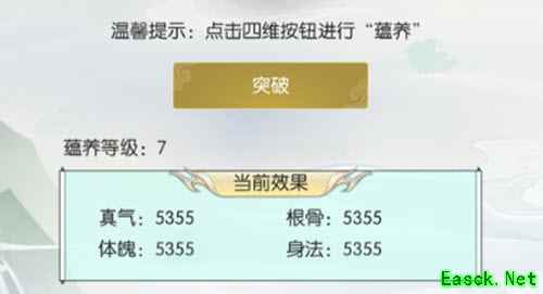 2、在为四项蕴养收集满经验后,四项真元彻底点亮,即可成功突破,增加属性,提升实力。