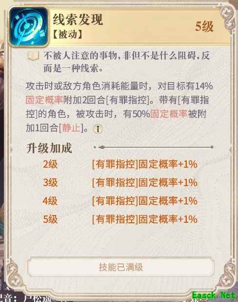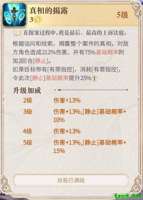 “静止”是《幻书启世录》最强大的控制技能,可以让对手无法行动,直接跳过自身的回合。而围绕着“有罪指控”,夏洛蒂最强的大招控制能够为玩家带来更多的惊喜。夏洛蒂的大招是有50%的基础概率(受到精准和抗性影响)让一名敌人“静止”两回合,如果这名敌人身上有“有罪指控”的debuff的话,在提高25%的基础概率。也就是说在控制有“有罪指控”的敌人时,夏洛蒂的大招控制基础概率高达75%,如果是满级的话,这个概率会达到100%。