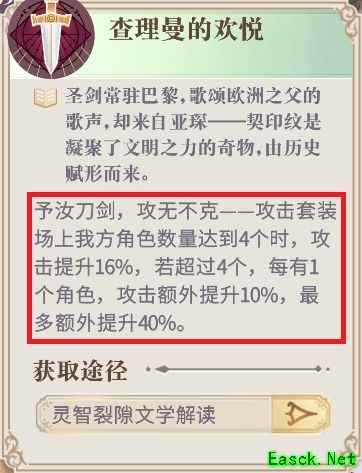 契印方面推荐带【查理曼的欢悦】,它的套装效果是我方角色越多攻击力越高,因此可以有效提高《罗兰之歌》罗兰的技能伤害。