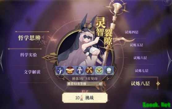 灵智裂隙一共三类关卡,各有八层。从第七层开始掉落5星契印,每次刷取需要消耗10体力。