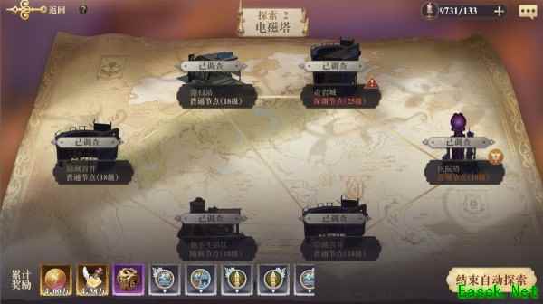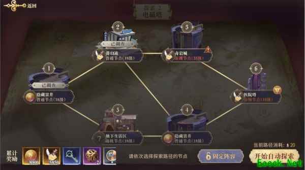 当各位玩家已经熟练的掌握了自动模式后,就可以考虑以下操作了。选择一片在探索区域,点击右下角的自动探索,合理的规划好行动路线,点击固定阵容,开始全程挂机探索。消耗的灵感和获取的材料相比手动模式不会有任何的变化,很适合挂机党刷材料刷经验,唯一需要注意的一点是,在此轮探索结束后,需要再次规划路线才能进行第二轮自动探索。