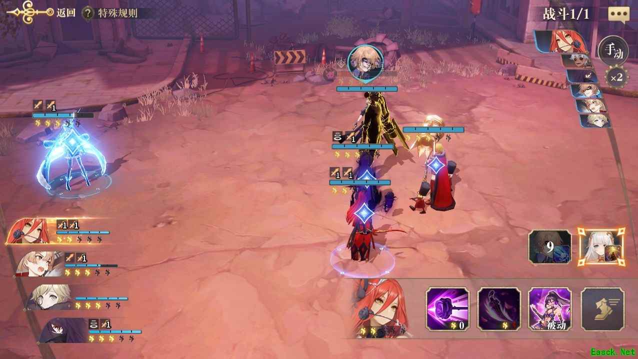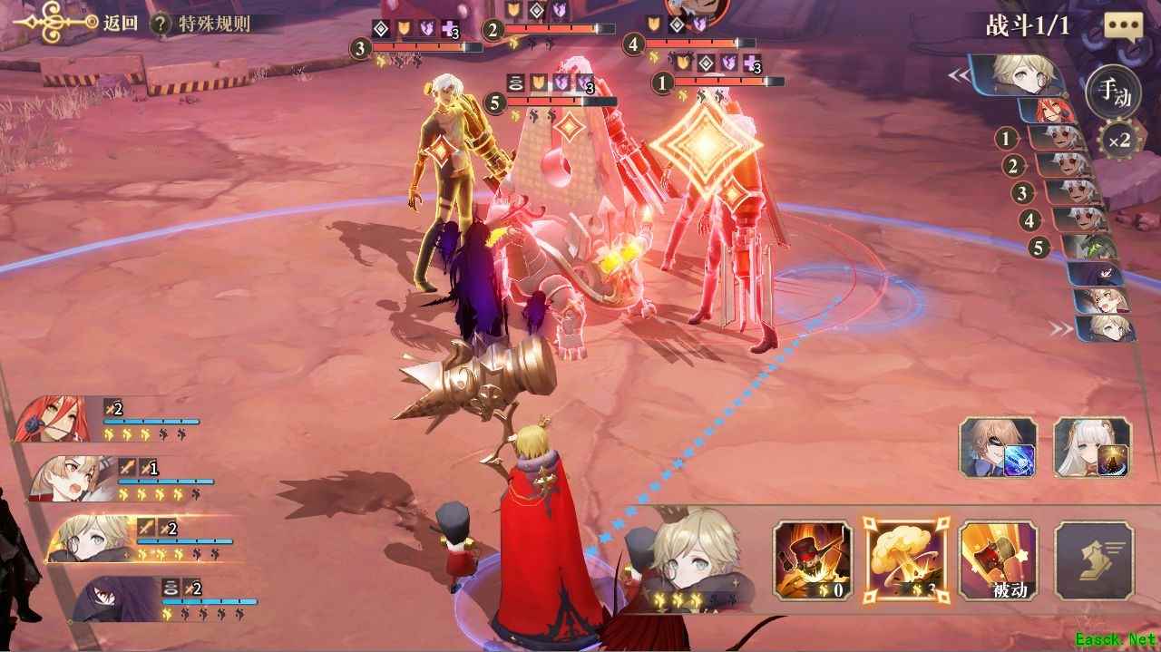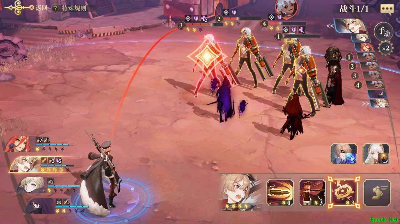 一般在怪物攒够3点能量的时候场上应该只剩1只,如果剩余1只以上,就需要依靠援护来扛过爆发了。不过要注意的是,本关的四只远程怪会优先攻击我方远程单位《论战争理论》卡琳,因此请优先给卡琳使用《沙之书》阿莱娜援护,另外其他人尽量分散站位,避免被怪物大招刮到。
