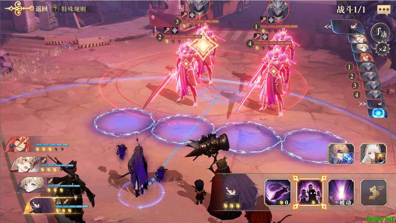 这里要注意的是,由于《论战争理论》卡琳的出手速度比纳兹快,而卡琳集火触发《胡桃夹子》纳兹普攻的群伤是输出的关键,因此第一轮卡琳在我方纳兹还没接近敌人时不要放技能,留能量等第二轮所有人都接近敌人后再集火。