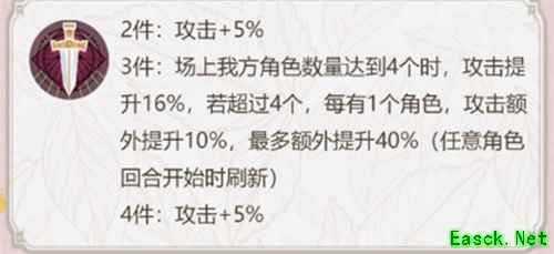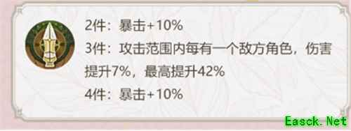 20%暴击率加成,敌人在场数量越多伤害倍率越高,非常契合珍珑【大龙对杀】的技能机制,即:根据攻击范围内的 我方角色数量增伤。在怪多的副本中增伤收益高,怪少的BOSS本不太推荐。