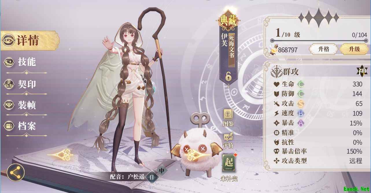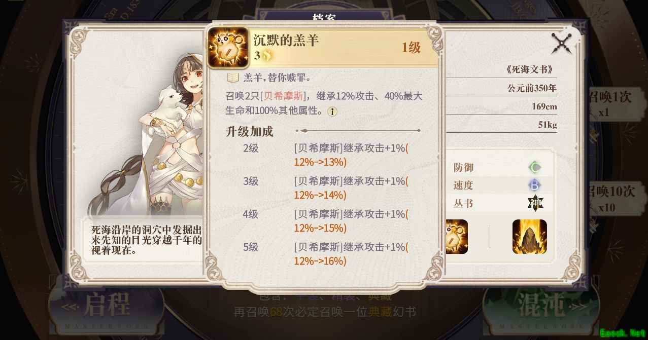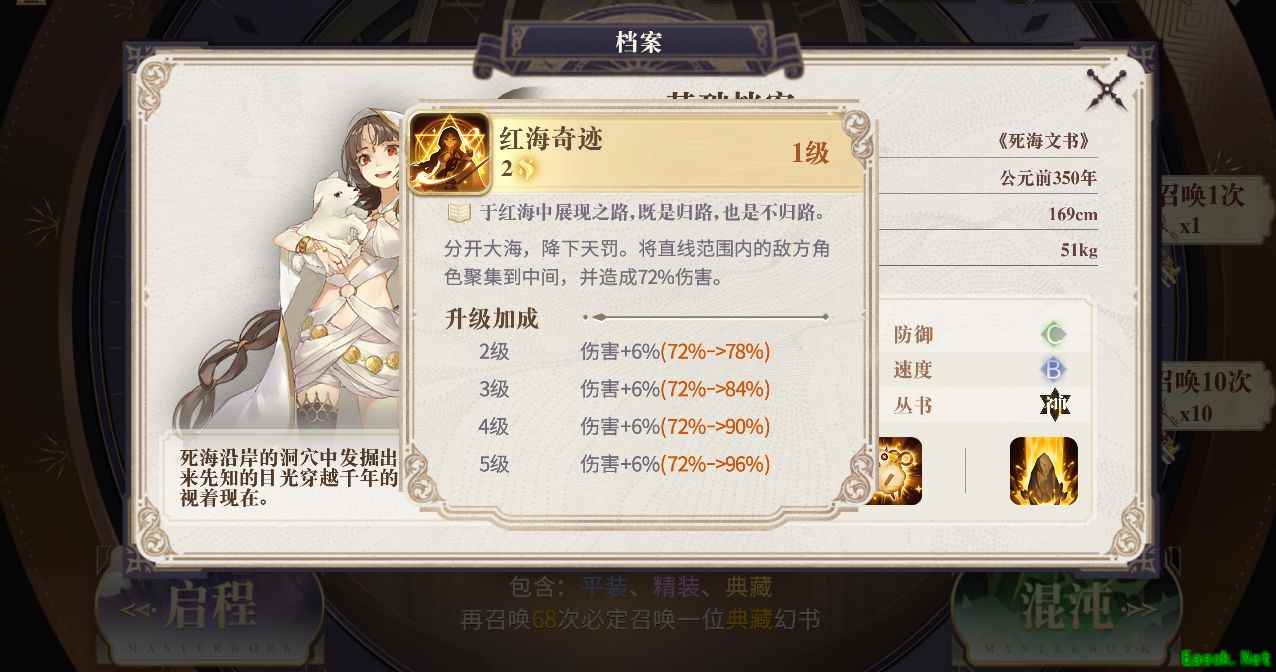 《死海文书》伊芙的面板比较出色,攻击力评级为S级,作为一本非主流输出幻书,这个属性相当理想。稍有遗憾的是速度属性,仅有109点,所以在搭配契印纹的时候优先堆叠速度为优。