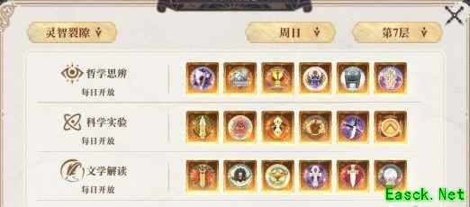 除此之外,灵智裂隙每天产出的契印纹时不同的,周一到周六都会有变化,周日会产出产出所有契印纹,因此我们要看准主力阵容需要的契印纹,再看哪一天是产出这些契印纹的,然后再去刷,可以避免不必要的浪费。