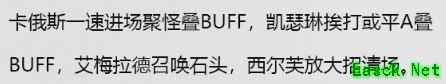 基本上就是卡俄斯开局进场直接聚怪和上buff,凯瑟琳的任务就是打人和被打,借此给对方上buff,之后靠艾梅拉德的召唤物和西尔芙的大招输出。