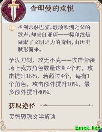 其次对于主力输出来说,攻击力提升契印纹【查理曼的欢悦】是最合适不过的了。它的特殊效果是场上我方人数越多,造成的伤害越高,当我方的召唤物足够多时,这套契印纹可以打出非常爆炸的伤害。