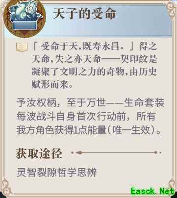 首先对于召唤流阵容,在召唤出足够召唤物前,还是需要幻书自身来抗伤害的。而【天子的受命】的套装效果不但可以增加幻书的生命值,同时还可以让装备这套契印纹的幻书行动时,为我方所有幻书增加1点能量,从而让队伍在第一轮就可以直接发动书界技能进行爆发,因此是前排必带的契印纹。因为它的被动能力是唯一效果,所以有且只有一位幻书携带即可。