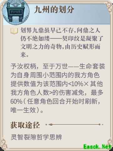 虽然召唤物能够抗住非常多的伤害,但遇到群伤较多的关卡时,有时还是会力不从心。契印纹【九州的划分】的特殊效果是为自身小范围内的角色提供减伤效果,每有一个其他我方角色,减伤增加10%。对于召唤流阵容来说,如果你觉得前排的坦度不足以撑过对方的爆发,那么【九州的划分】可以大大增加前排幻书的坦度。