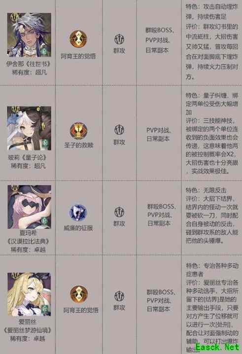 一个很不错的群攻卡牌。虽然自身的输出不高,但是是抱大腿的顶级工具人,可以简简单单的让主力的输出提高一半。