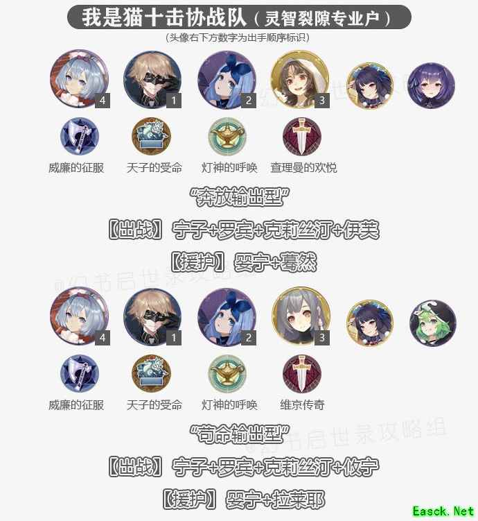 宁子:十击协战队核心输出,技能+补全拉满后协战概率高达100%,由于召唤物也会触发协战,配合罗宾、克莉丝汀、伊芙及他们的召唤物,宁子每回合可以出手10次,因此称为十击协战队。