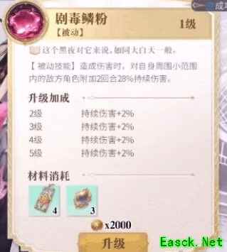 一说起游戏里的昆虫大家往往会想到毒,昆虫记的被动便是如此。在战斗阶段昆虫记每次造成伤害后会对自身周围小范围内的敌方角色附带两回合的持续扣血效果,在满级时能够造成34%攻击力的伤害。伤害虽然不高但是值得注意的是每次昆虫记造成伤害都会刷新这个负面效果,因此一场战斗下来总共造成的伤害还是非常可观的。