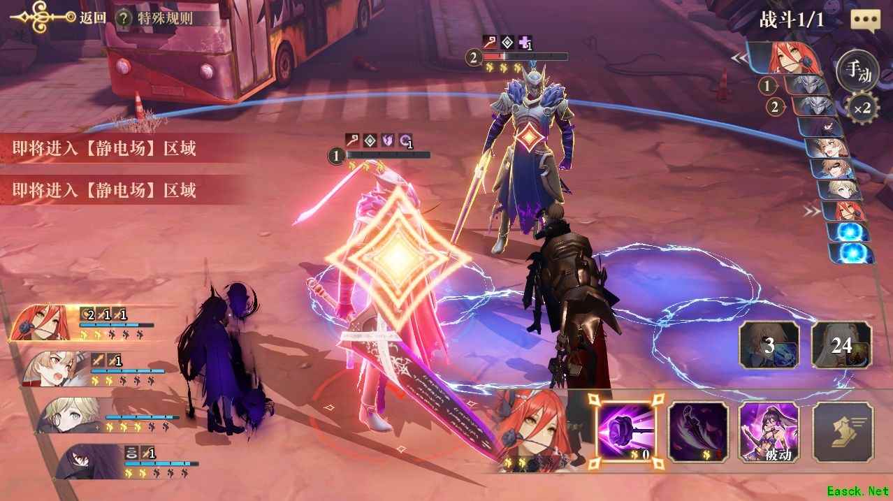 进入战斗后,由于初始静电场并没有生成在我方脚下,因此第一轮战斗可以主动一些,《大众心理研究》卡俄斯聚怪,《胡桃夹子》纳兹群伤,《卡门》卡门单体爆发。而第一轮过后,静电场就会生成在我方脚下,因此需要手动进行移动。