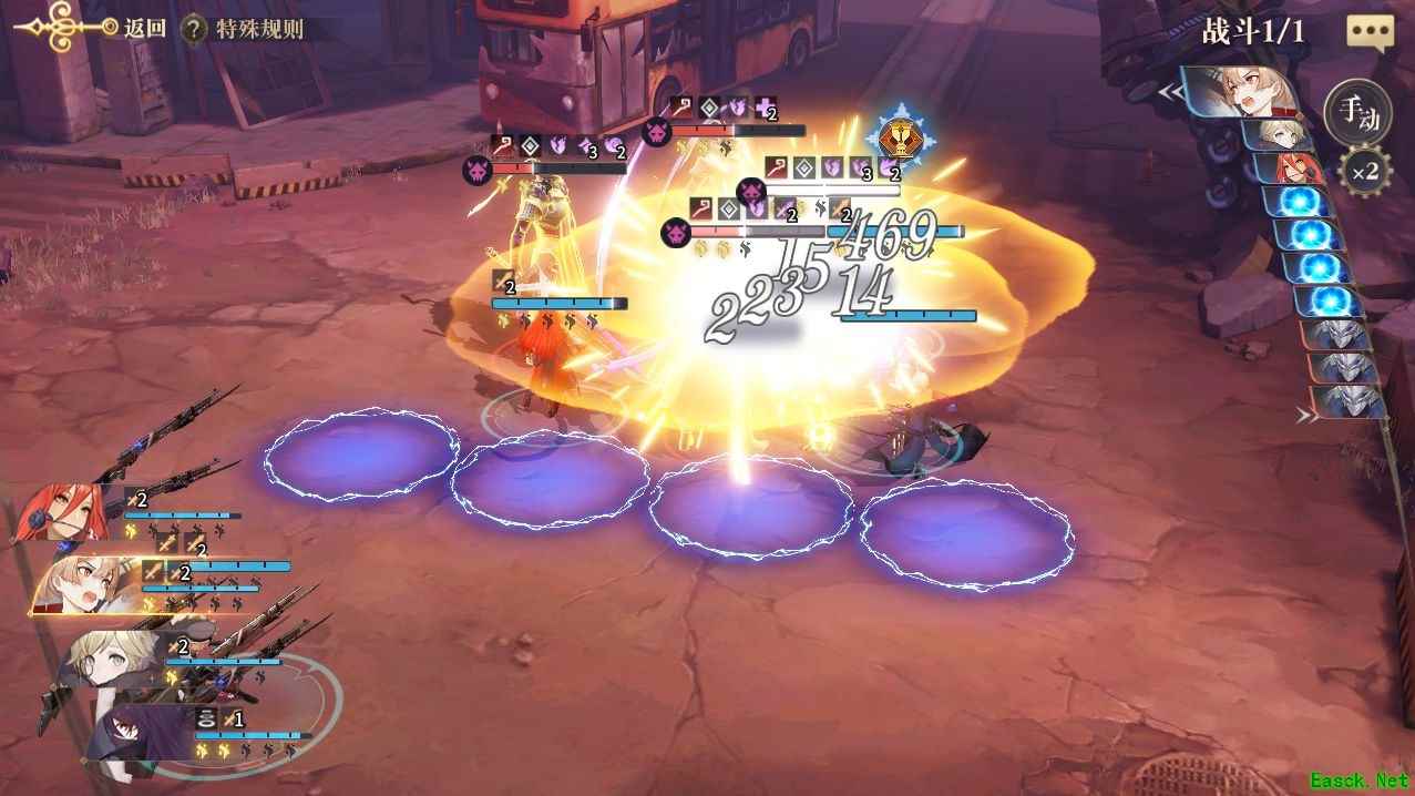 这里要注意的是,由于《论战争理论》卡琳的出手速度比纳兹快,而卡琳集火触发《胡桃夹子》纳兹普攻的群伤是输出的关键,因此第一轮卡琳在我方纳兹还没接近敌人时不要放技能,留能量等第二轮所有人都接近敌人后再集火。