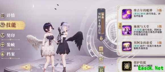 贝阿朵&维吉尔的恢复能力虽然和《诗经》攸宁不相上下,但和攸宁还是有很大区别的。首先贝阿朵&维吉尔的普攻伤害会比攸宁高一些,但只能治疗自身。书界技能“地狱与天堂”是大范围技能,造成伤害的同时治疗范围内所有友方单位,在范围上比攸宁略小一点。贝阿朵&维吉尔没有被动技能,取而代之的是多了一个主动技能,“贝阿朵的慈爱”的效果是消耗一点能量选择我方一名角色进行治疗净化,有很高的机动性。