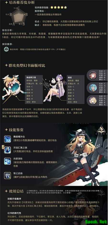 首先是日常任务推图,海底的群体印记增伤还是非常好用的;其次是boss地图(学会boss等),敌方单位少,印记收益低,不推荐;最后是pvp战斗,目前的pvp环境中比较喜欢功能性较强的幻书,如海底这种直接增伤的秒人的幻书并不适合出现,因此也不推荐。