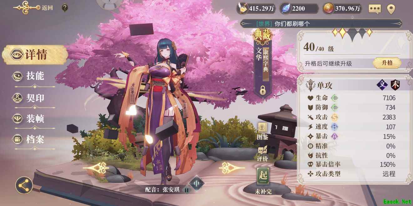 标着S攻,但是技能伤害基数小,主要是速度提升加debuff用。暴击基数15%,被动提升25%,合起40%起步,带皇帝攻伐勉强算个副c。