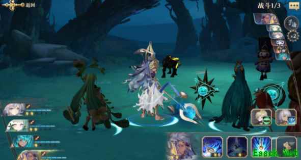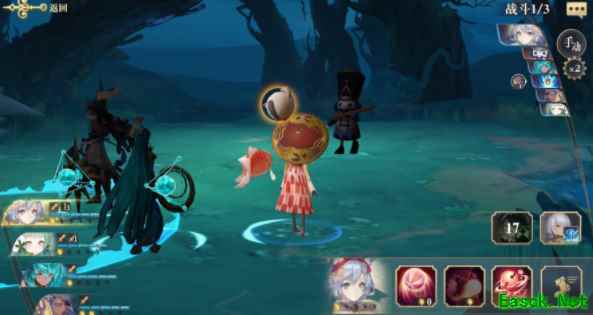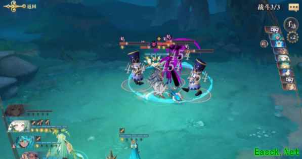 为了能够打败她们,己方幻书们要在前一波中积攒好能量,在这波开局时,就全部大招都放出来对准她攻击,艾梅拉德召唤出贤者之石贤者之石一旦被攻击就会扩散伤害,帮助玩家一起打BOSS,接着宁子开出猫戏人间,打出暴击,卡琳旁边的两个小怪还是相对轻松,玩家只要以卡琳为主目标进行不断进攻就行了,这样便能顺便消灭小怪了。