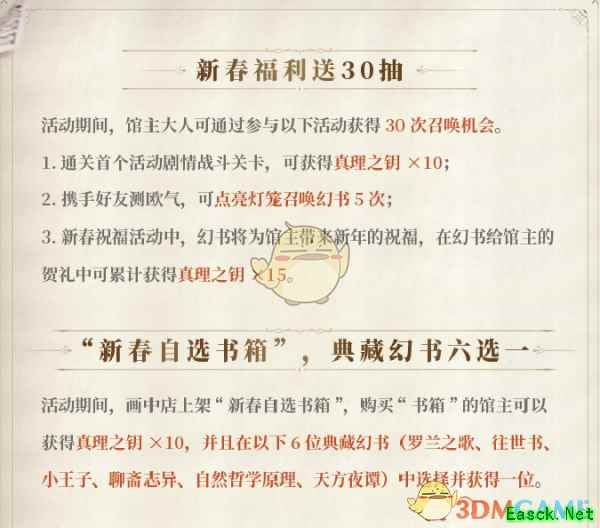 以上就是小编整理的关于《幻书启世录》新春福利30抽介绍的全部内容,更多游戏攻略请持续关注易采游戏网!