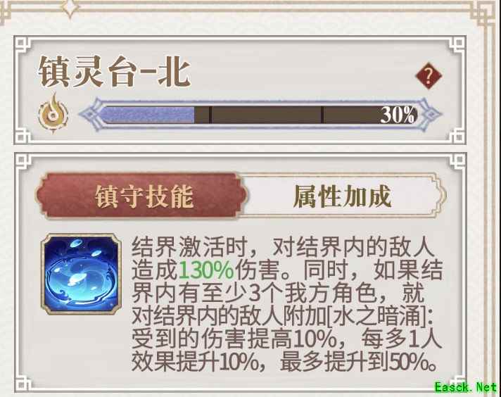 镇守技能:结界激活时,对结界内的敌人造成130%伤害。同时,如果结界内至少有3个我方角色,就对结界内的敌人附加[水之暗涌]:受到的伤害提高10%,每多1人效果提升10%,最多提升到50%